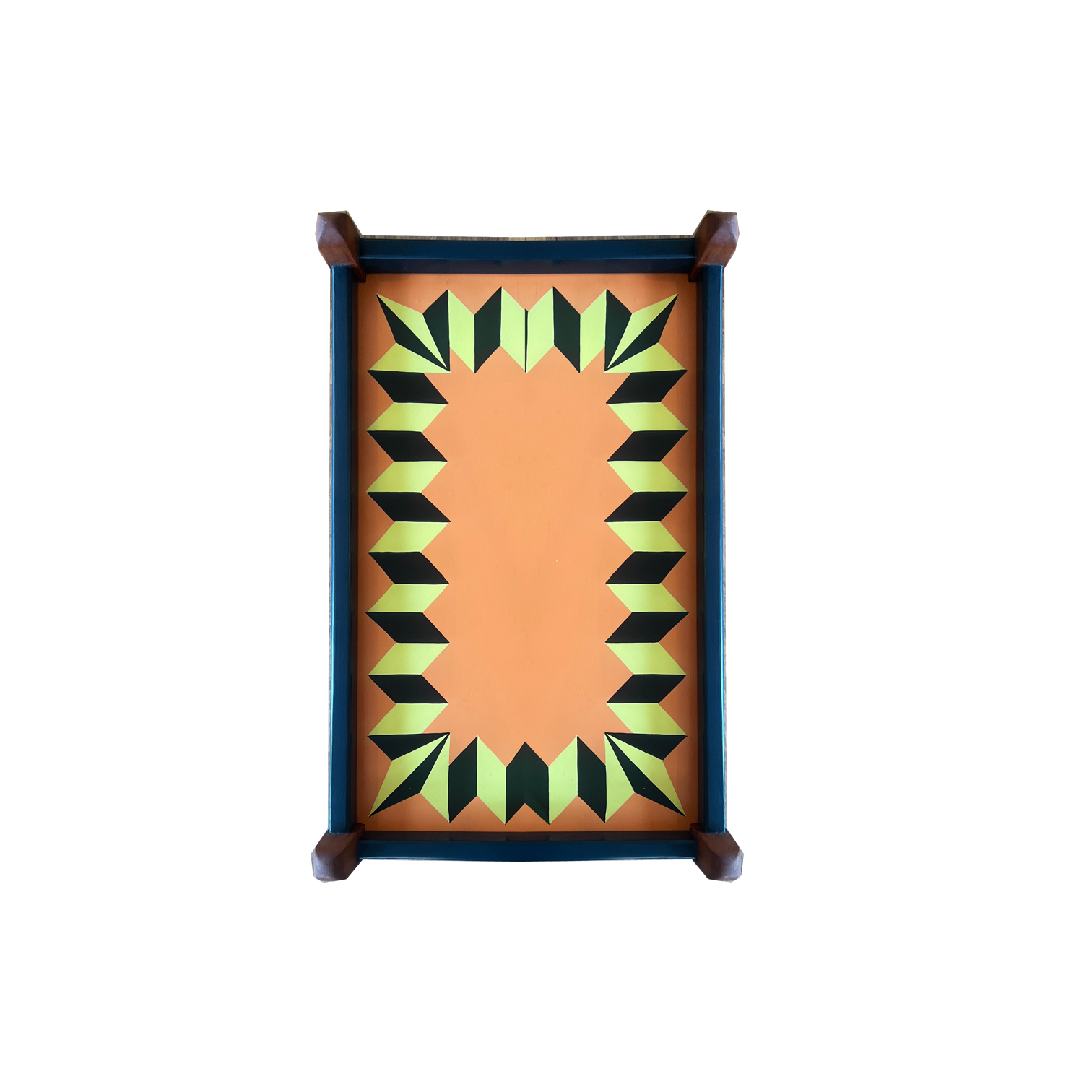 This striking upcycled two-tier side table combines functionality with bold design. Originally a simple wooden frame with shelves, it has been carefully restored and transformed with hand-painted surfaces featuring vibrant geometric patterns in orange, yellow, and black. The result is a one-of-a-kind piece that brings character and energy into any space. Perfect as a side table, display stand, or accent piece, it showcases how upcycling can breathe new life into vintage furniture while making a strong visual statement.