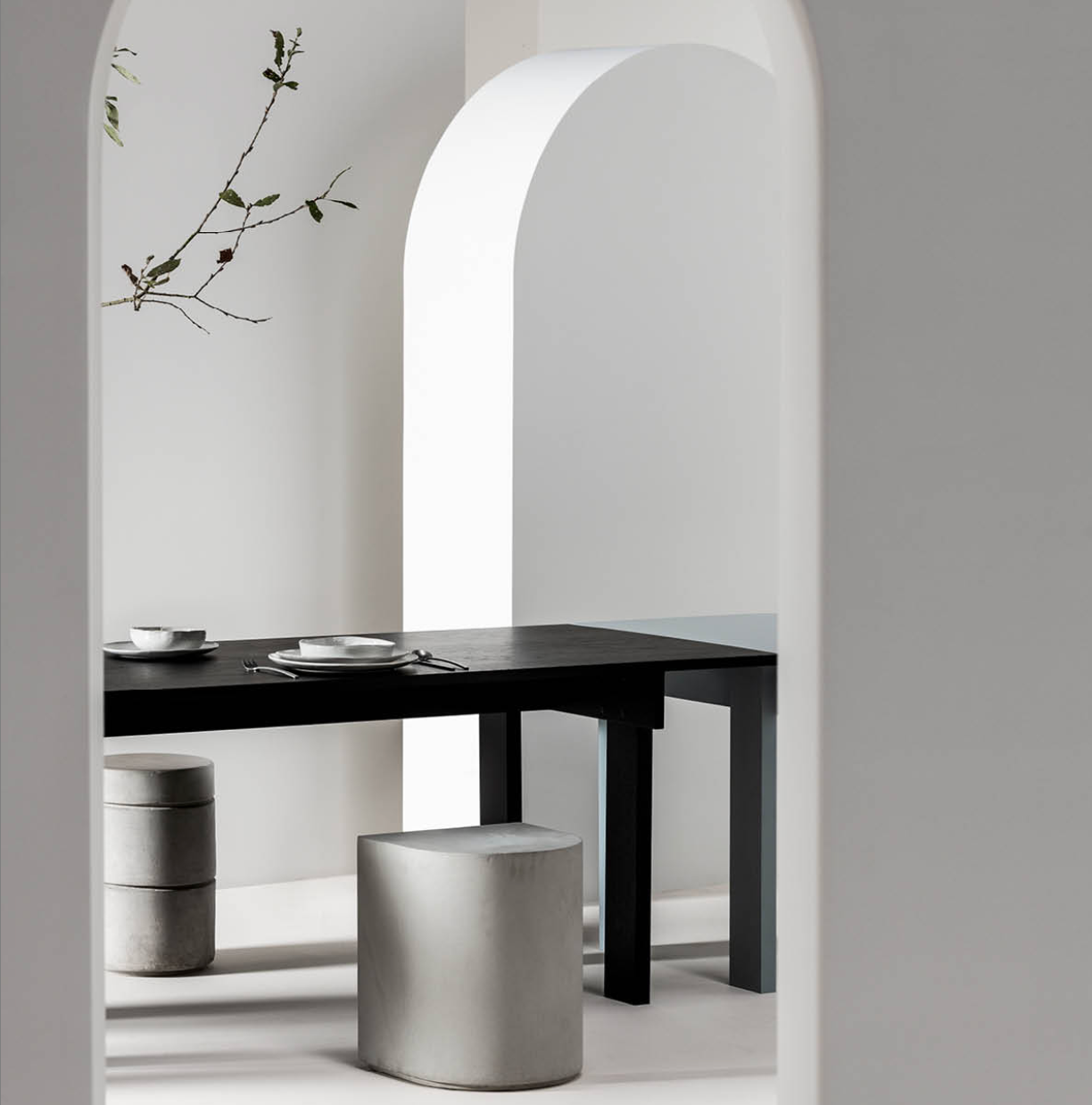 Marie also designed two concrete stools, named Mariette, after her grandmother, which are placed together as puzzle pieces to create more shapes. The rounded shapes have something feminine about them, contrasting nicely with the hard, masculine concrete. With the Mariette stools, you have not only shapes but also materials. Marie always finds it interesting to position a warm natural material such as wood alongside an industrial, man-made material such as concrete.