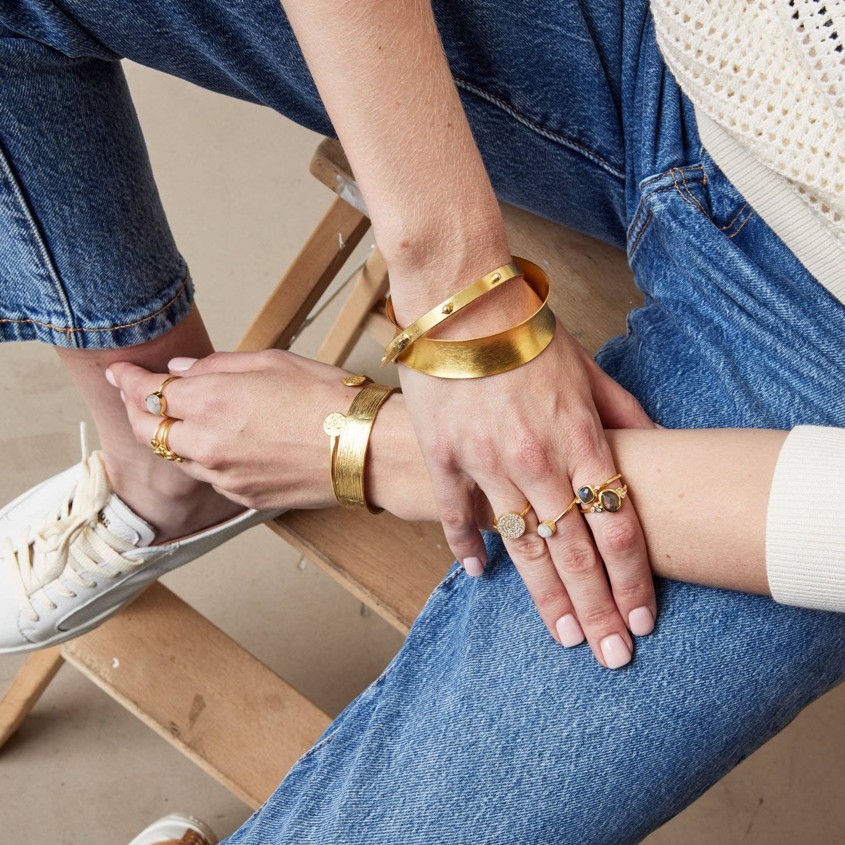 This flat bangle has a stunning linear texture which is organic and subtle. The bangle is lightweight and can easily be worn everyday layered up with other bracelets or on its own.