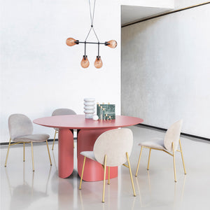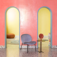 Ola originates from a simple idea but at the same time represents a complex concept – a welcoming arm chair created utilising four individual curved sheets. Each sheet converges towards a single centre. Four sheets become two sheets for the variation without arm rests. The metal frame has an essential and graphic silhouette in contrast with the padded rounded forms. The cover is completely removable.
