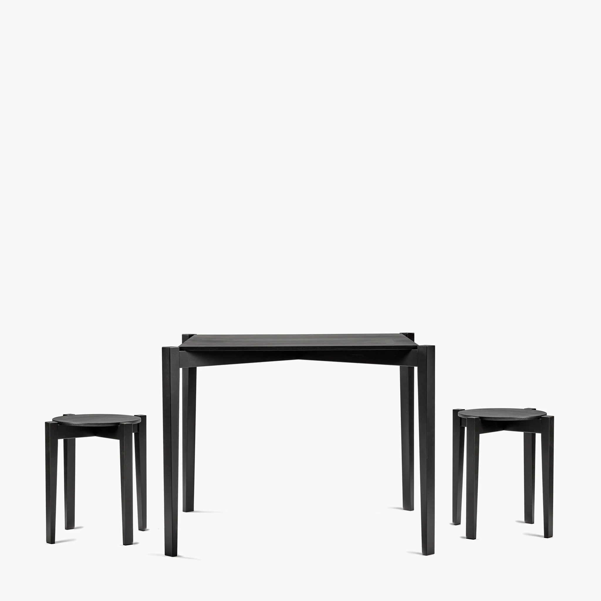 The stackable Éloïs tables and stool provide a sophisticated, deft solution to various practical needs. Four tapered legs sit outside the top, foregrounding the elegantly skeletal architecture of the design. A cross-braced structure connects the legs and supports a square, rectangular or round top surface. The Éloïs Stool and Éloïs Round Table echo each other’s proportions at drastically different scales, both available on our webiste.