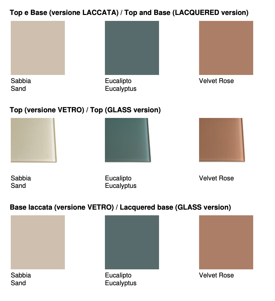 Top: Available in either 30 mm lacquered MDF or 8 mm extra-clear back-lacquered tempered glass with anti-scratch treatment.