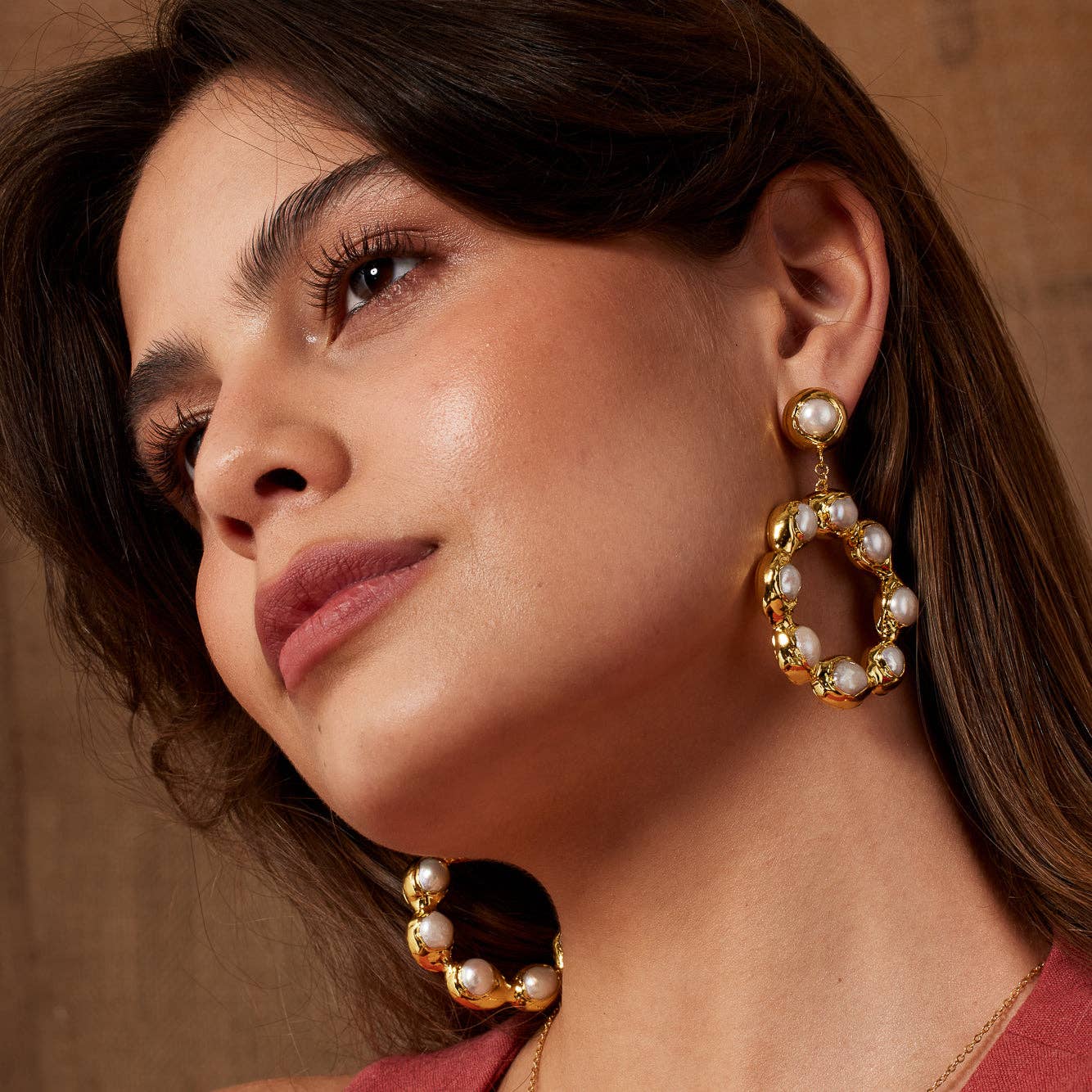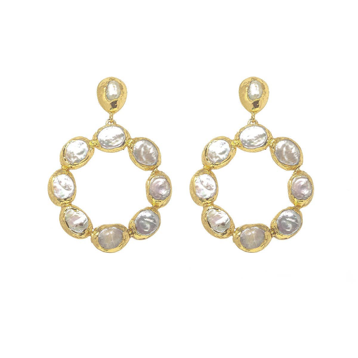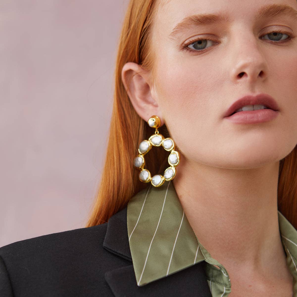 Freshwater pearls Gold electroplated with sterling silver. The earrings feature 18 stones in total and each piece is unique. Stunning and versatile, the Wanda is the perfect statement pop of colour.