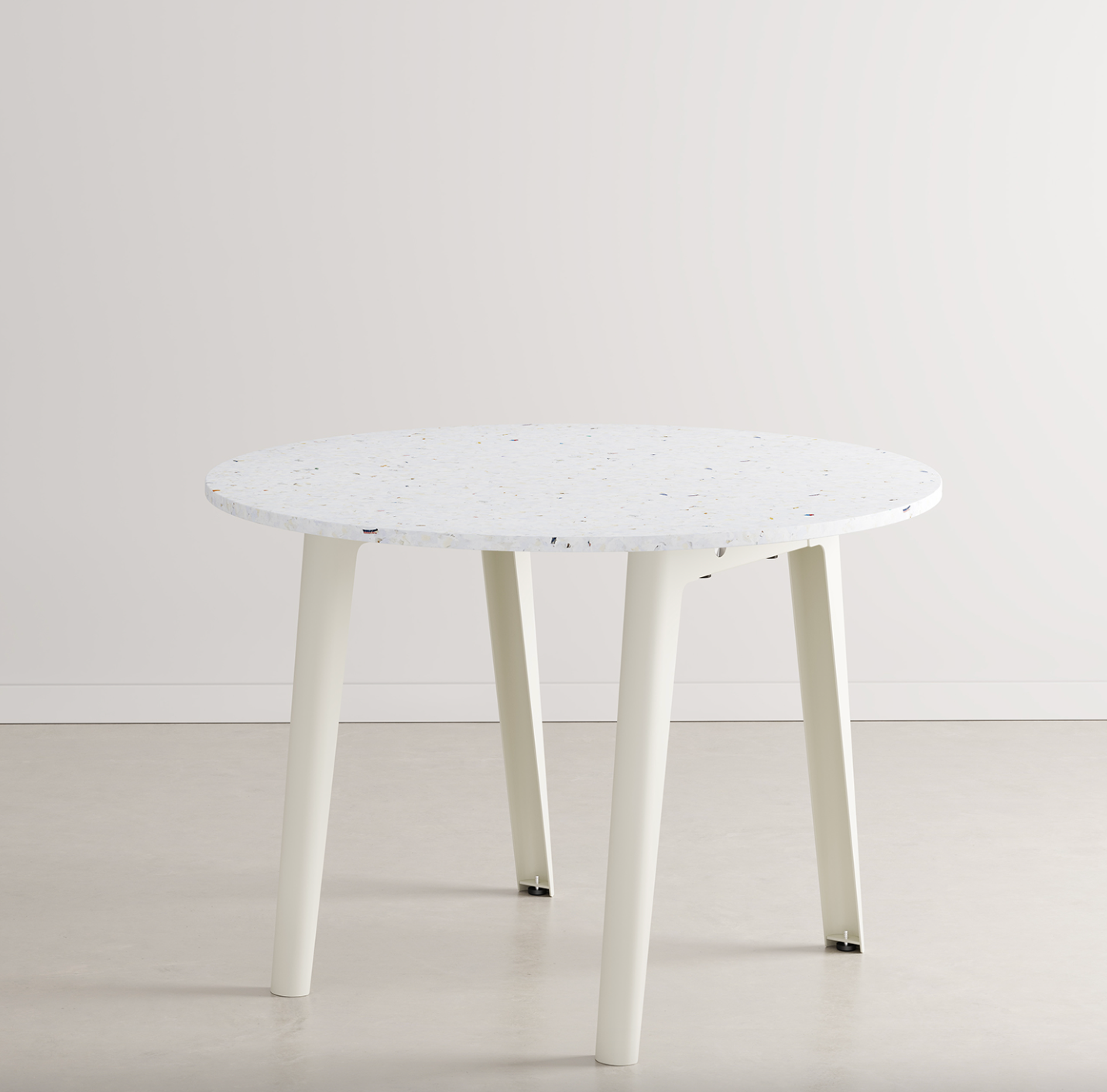 The New Modern round table in recycled plastic is ideal for 4 to 6 people (110cm diameter). The tabletop is made with hundreds of recycled yoghurt cups. The burst of colours, gold or silver, comes from fragments of yoghurts labels, which gives clues about the plastic’s previous incarnation and makes each tabletop truly unique.