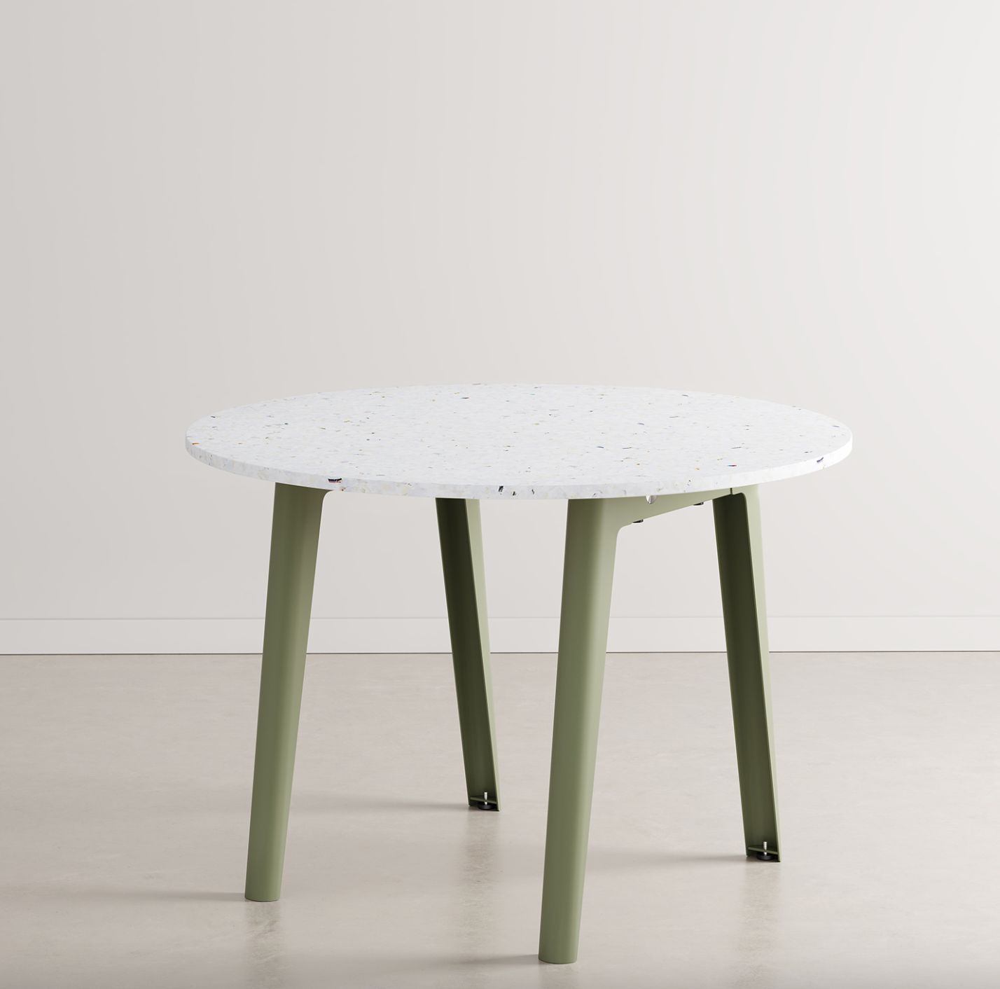 The New Modern recycled plastic tabletops are made in the UK, the steel table legs are made in Bulgaria while all mechanical and assembly parts are made in factory based in France near Chamonix.
