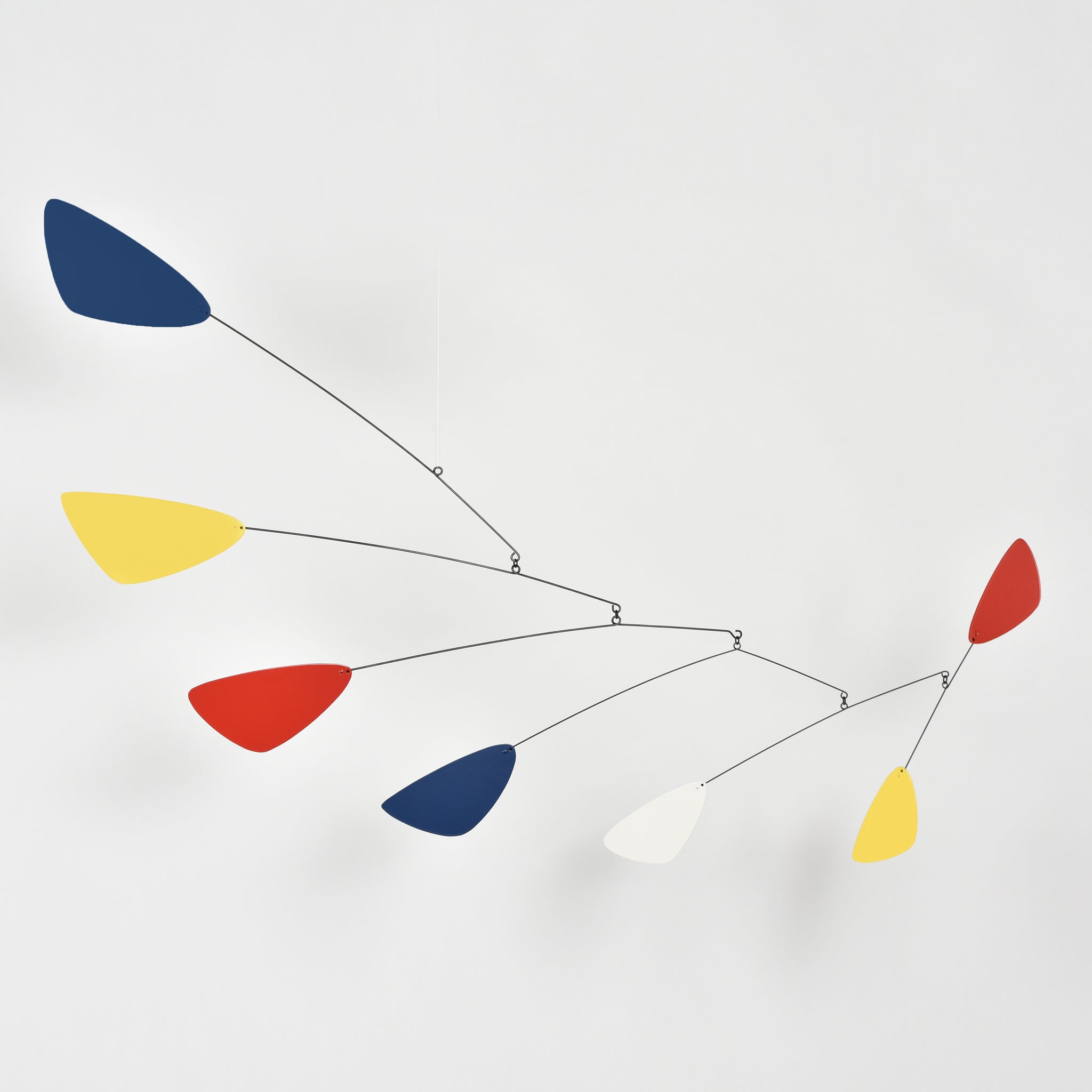 Very light, this hanging mobile uses the primary color palette inspired by the De Stijl movement - of which Piet Mondrian was a part - in a resolutely modern spirit. With finesse and delicacy, this mobile will find a place of choice in your interior. Mounted on hand bent steel rods, the blades are made from a high quality aluminum alloy. Like leaves, they twirl and float with the wind and the air circulation.