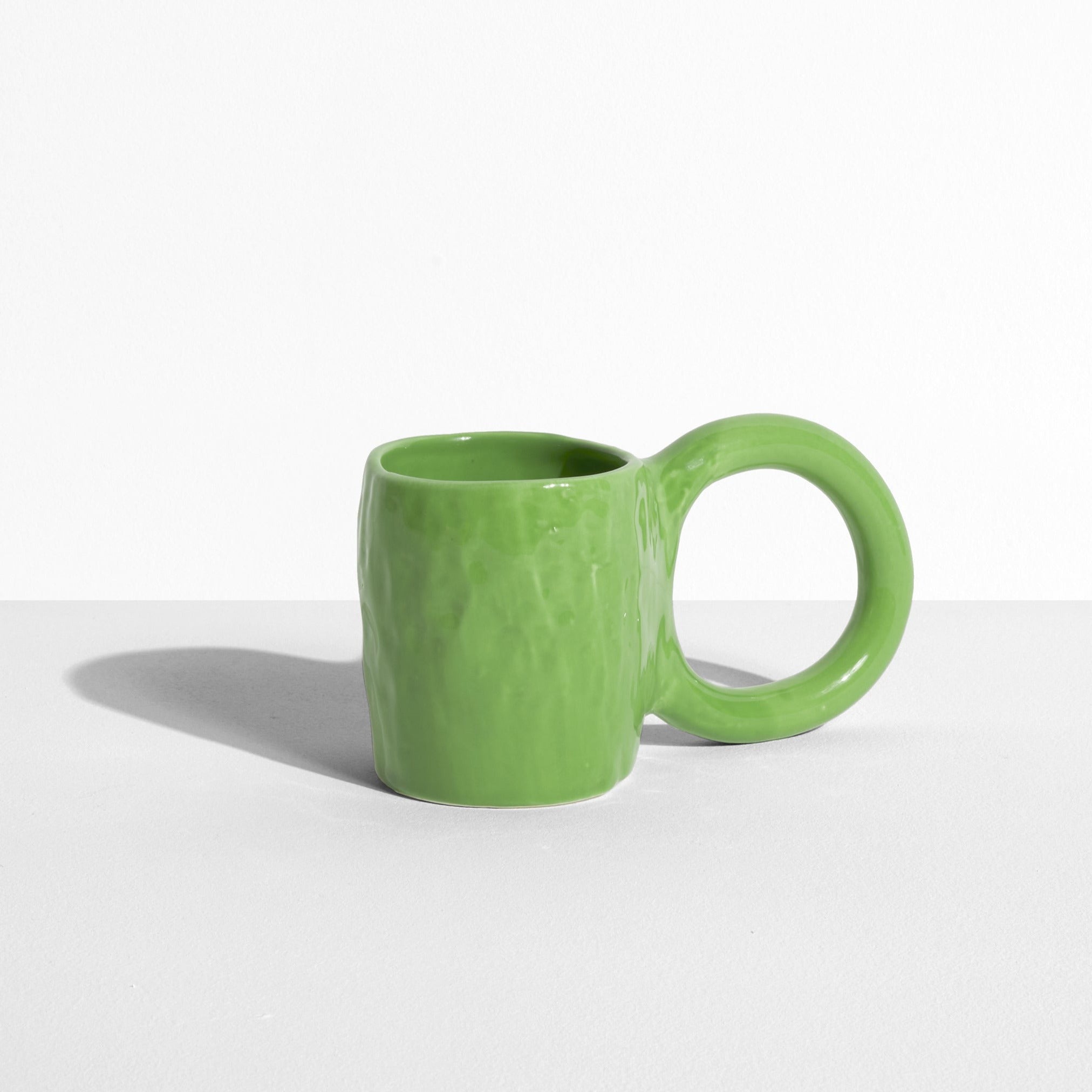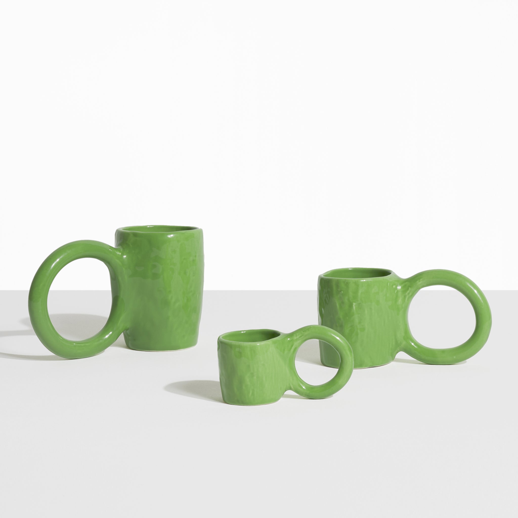 Drawing her inspiration from the world of baking, designer Pia Chevalier imagined her mugs as a collection of sweet treats. The oversized handle emulates the shape of a doughnut, and the enamel finish gives the piece a sugar-glazed coating look. Taking the culinary analogy to the next level, each of the collection’s colours hints at different doughnut flavours: Lemon, Blue, Bubble Gum, Vanilla and Blueburry. Pistachio is also available in Large size.