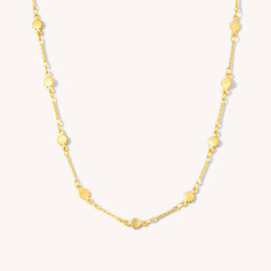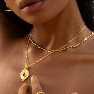 The Helios Necklace features a fine gold chain dotted with tiny sun charms; an ode to light, warmth, and fresh starts. Inspired by the Greek sun god, it's designed to brighten your stack (and your mood). Wear it solo for subtle golden glow or pair with your favourites for that golden-hour shimmer all day long.