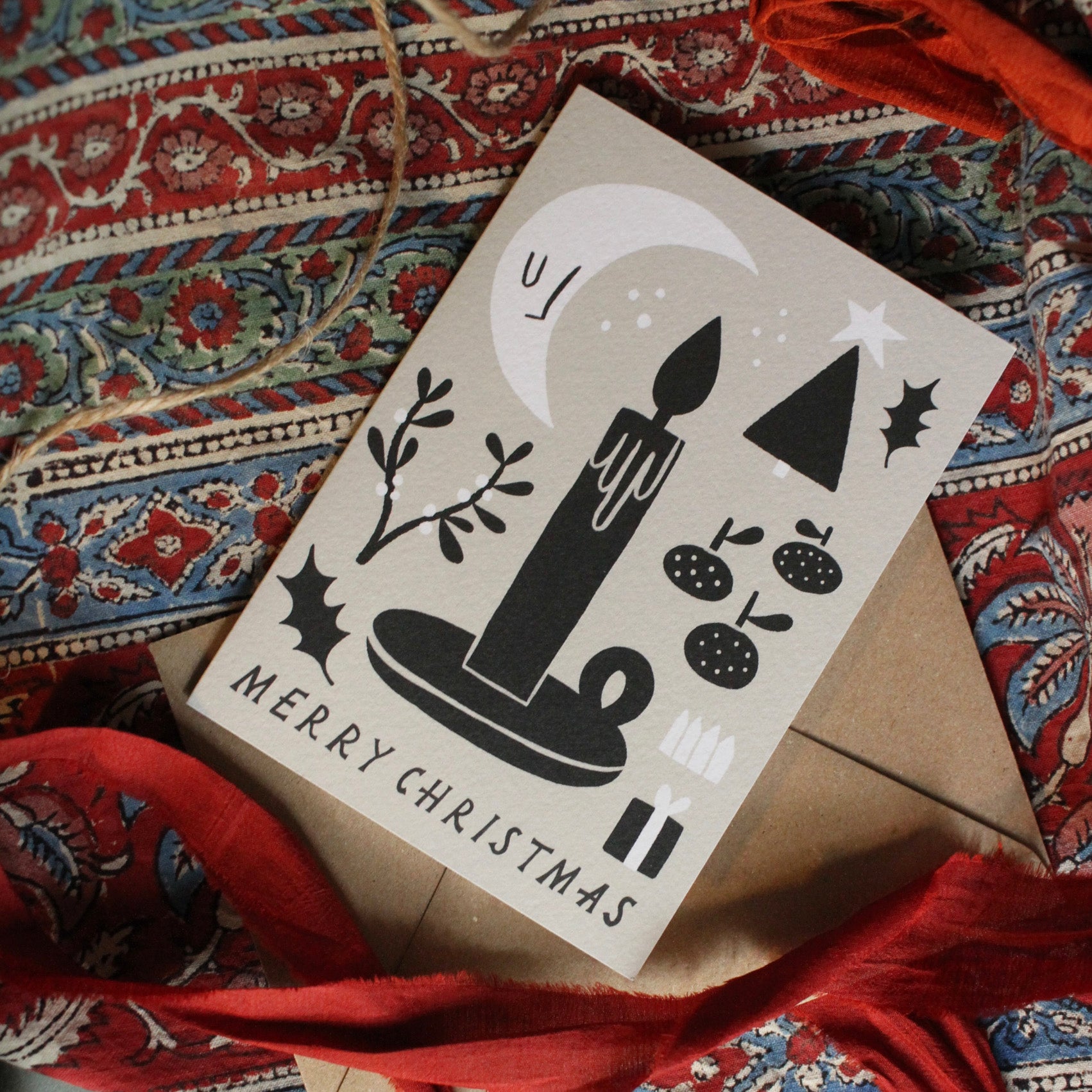 A contemporary illustrated Christmas card featuring a bundle of black and white festive motifs.