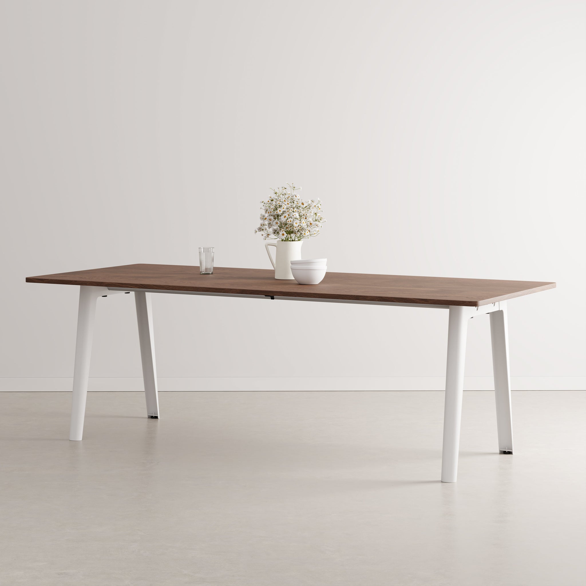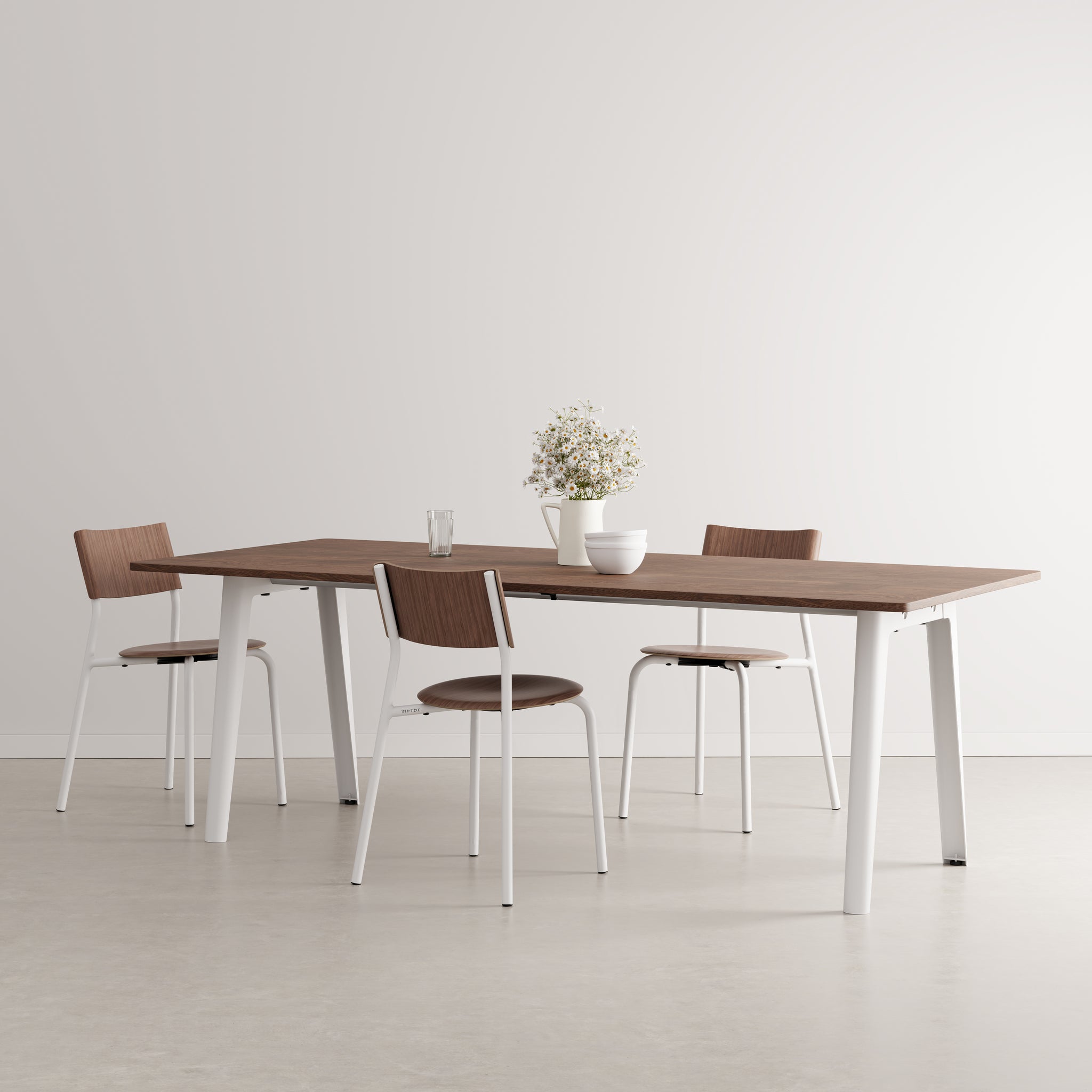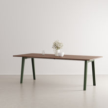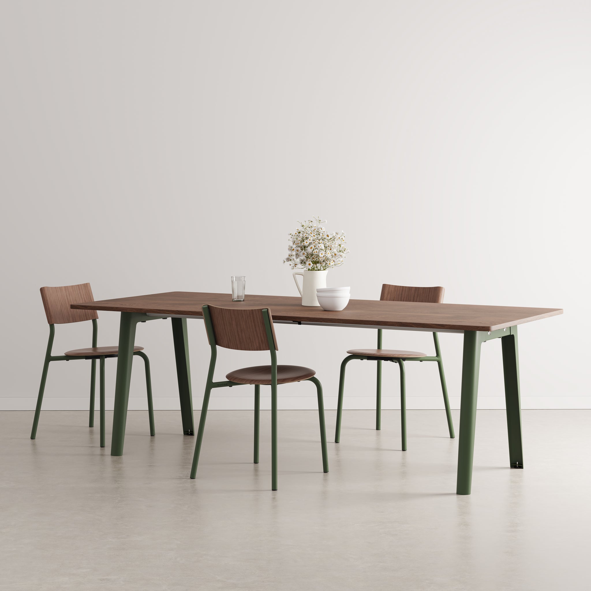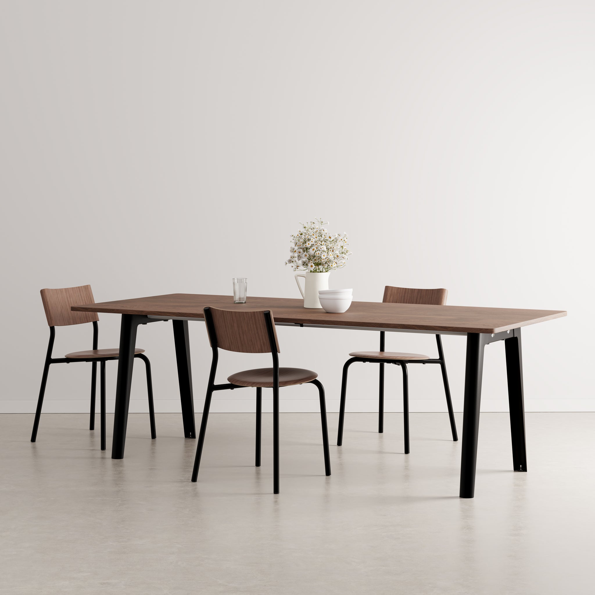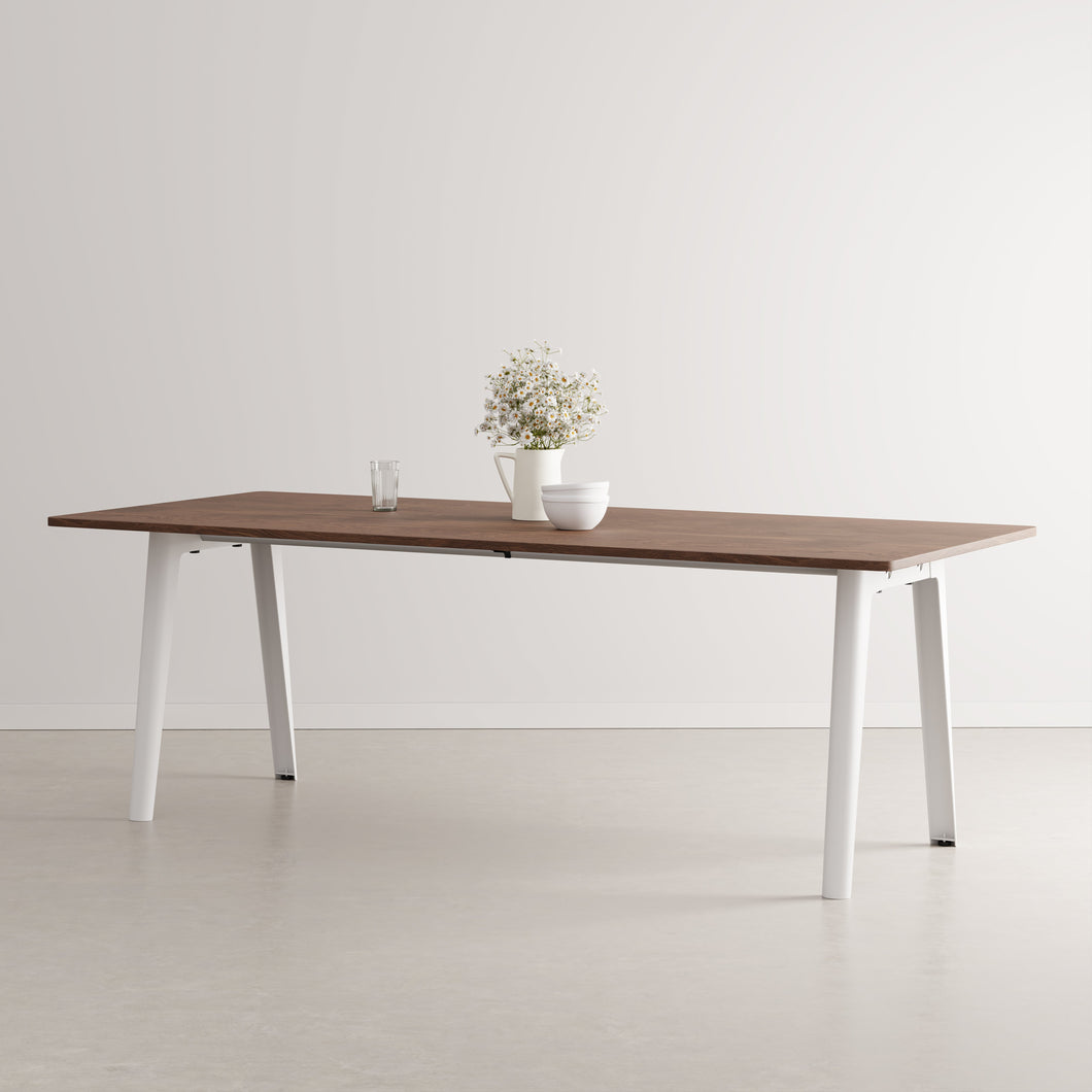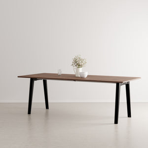 The New Modern walnut dining table combines timeless design with eco-conscious craftsmanship. Seating up to 10 guests, it features a sustainably sourced walnut-veneered tabletop and durable legs. Made 100% in Europe, this elegant table reflects a commitment to quality, minimal impact, and lasting style.