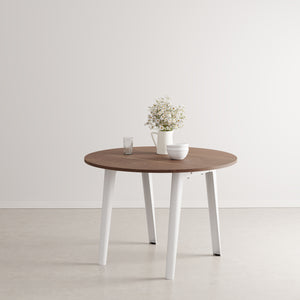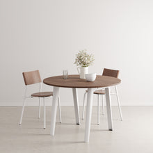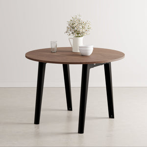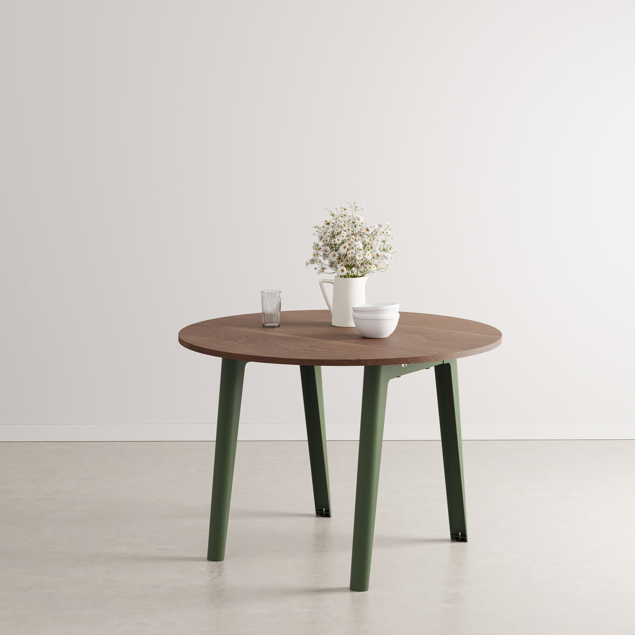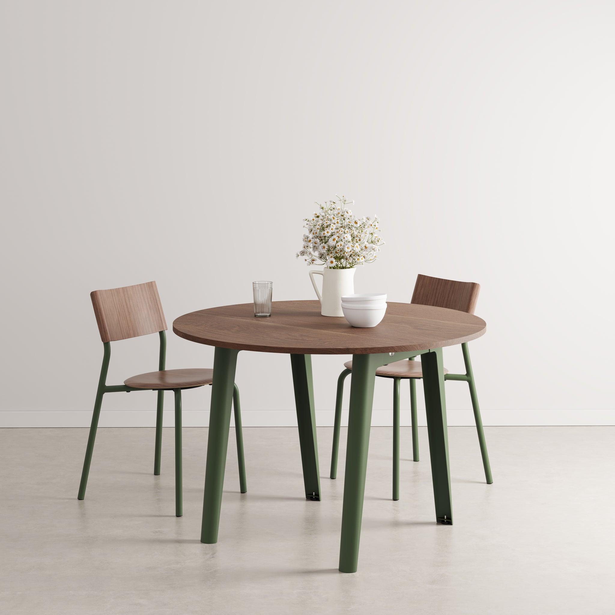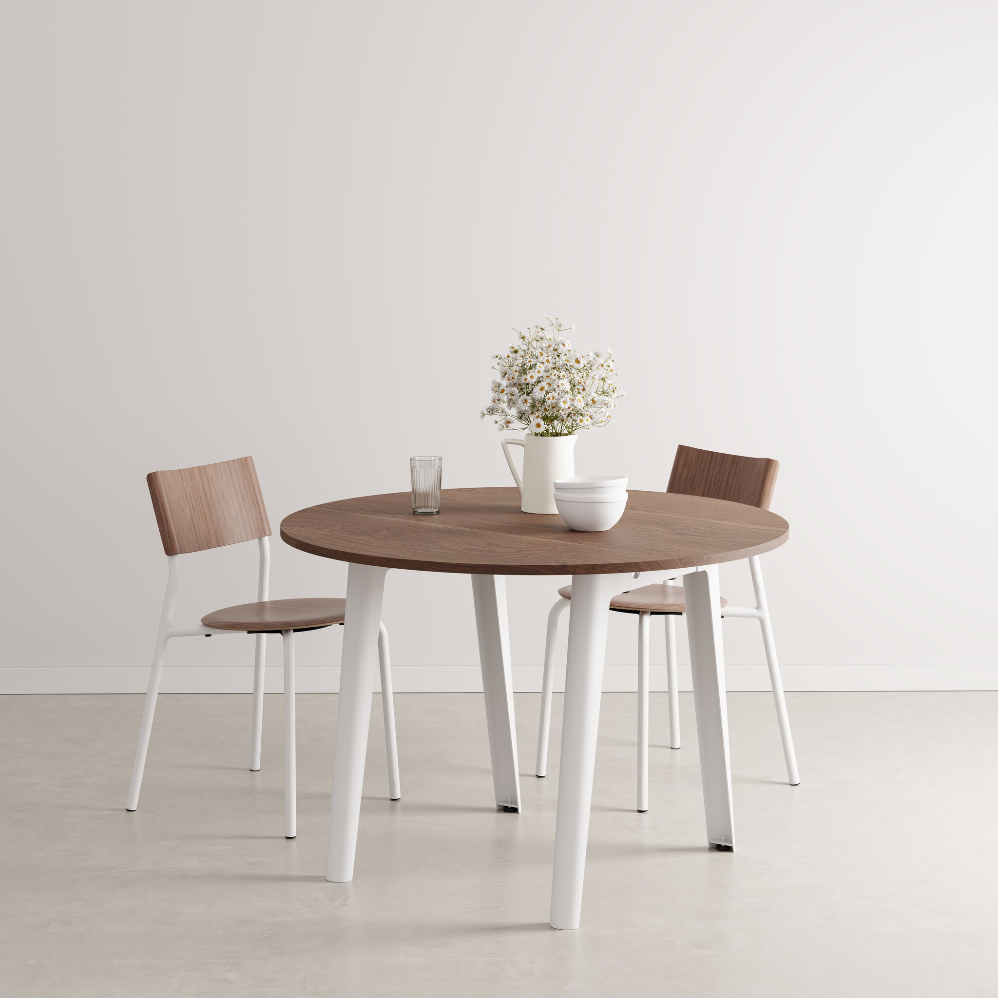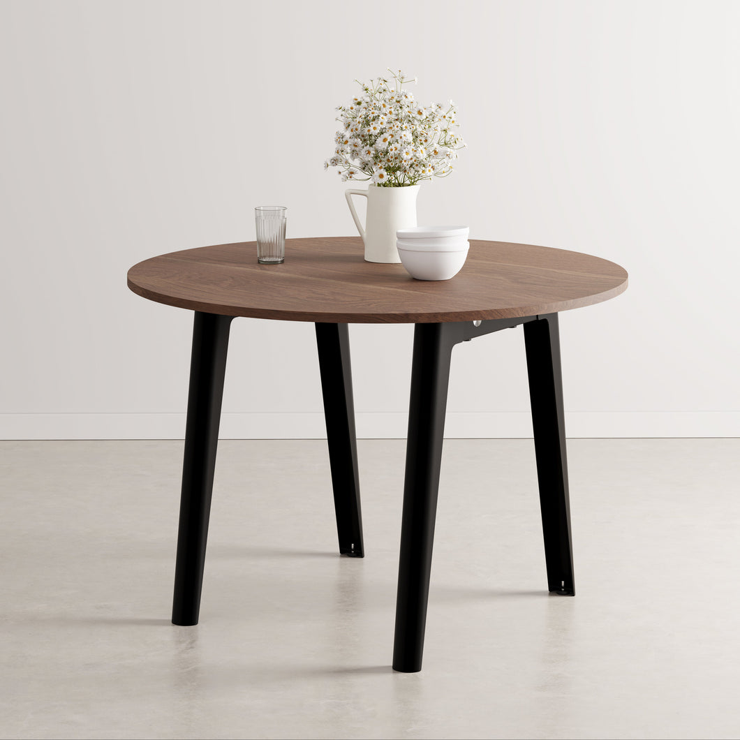 Elegant and eco-conscious, the New Modern round dining table seats 4 to 6 people and features a 110 cm diameter walnut-veneered top, sustainably sourced from European forests. Its modular steel base is both sturdy and minimal, with powder-coated legs and stainless steel supports. Designed for durability and flatpack delivery, it’s a timeless centerpiece made 100% in Europe.