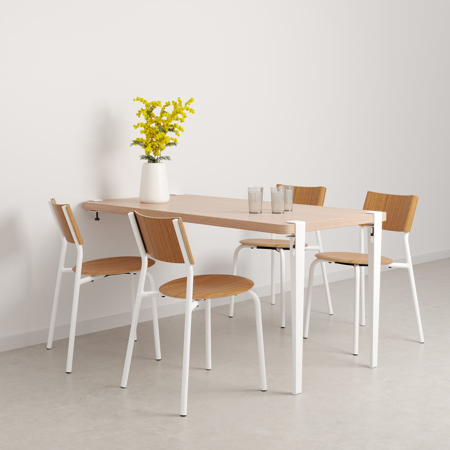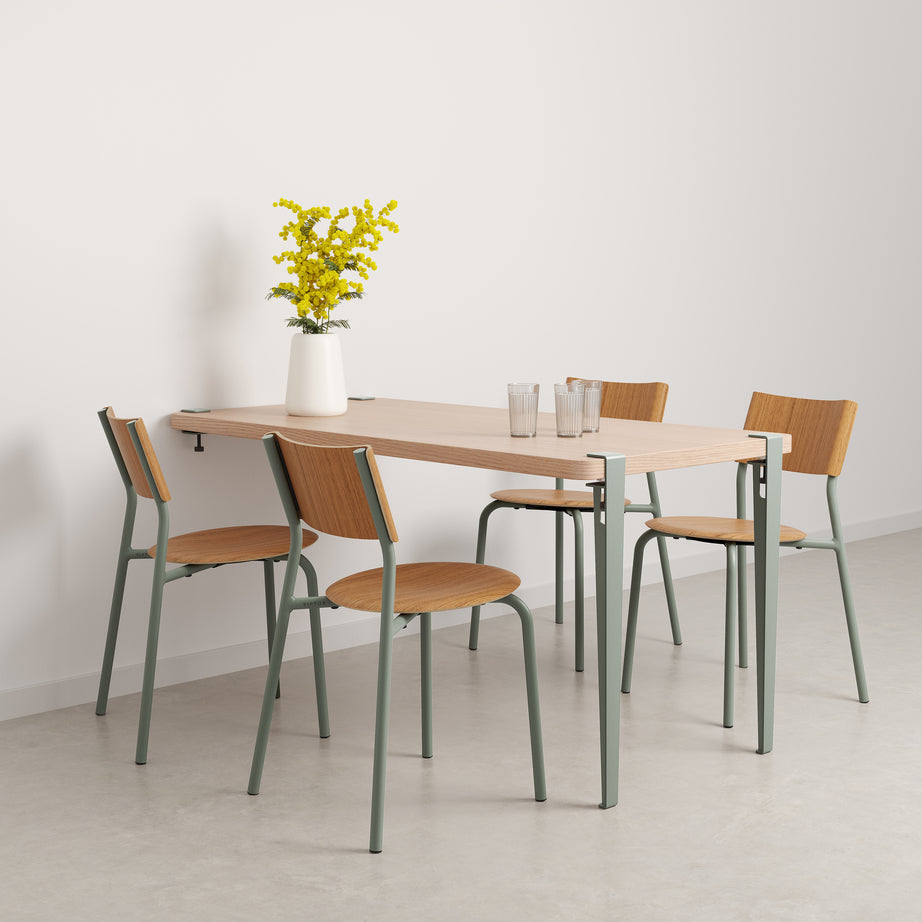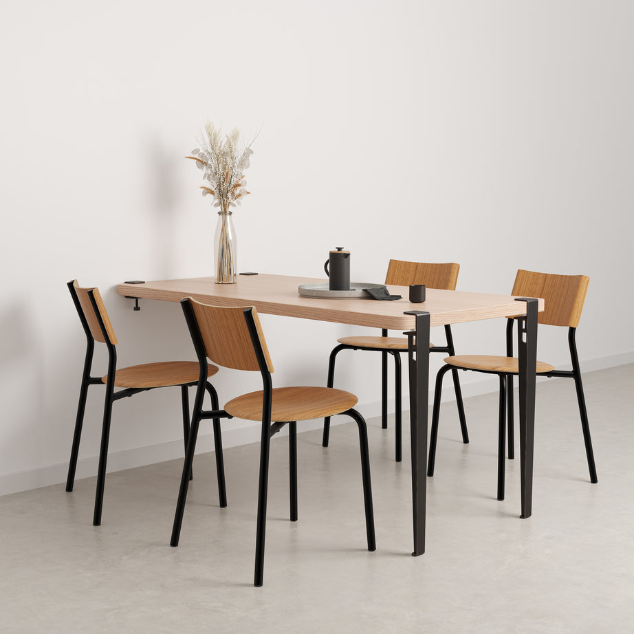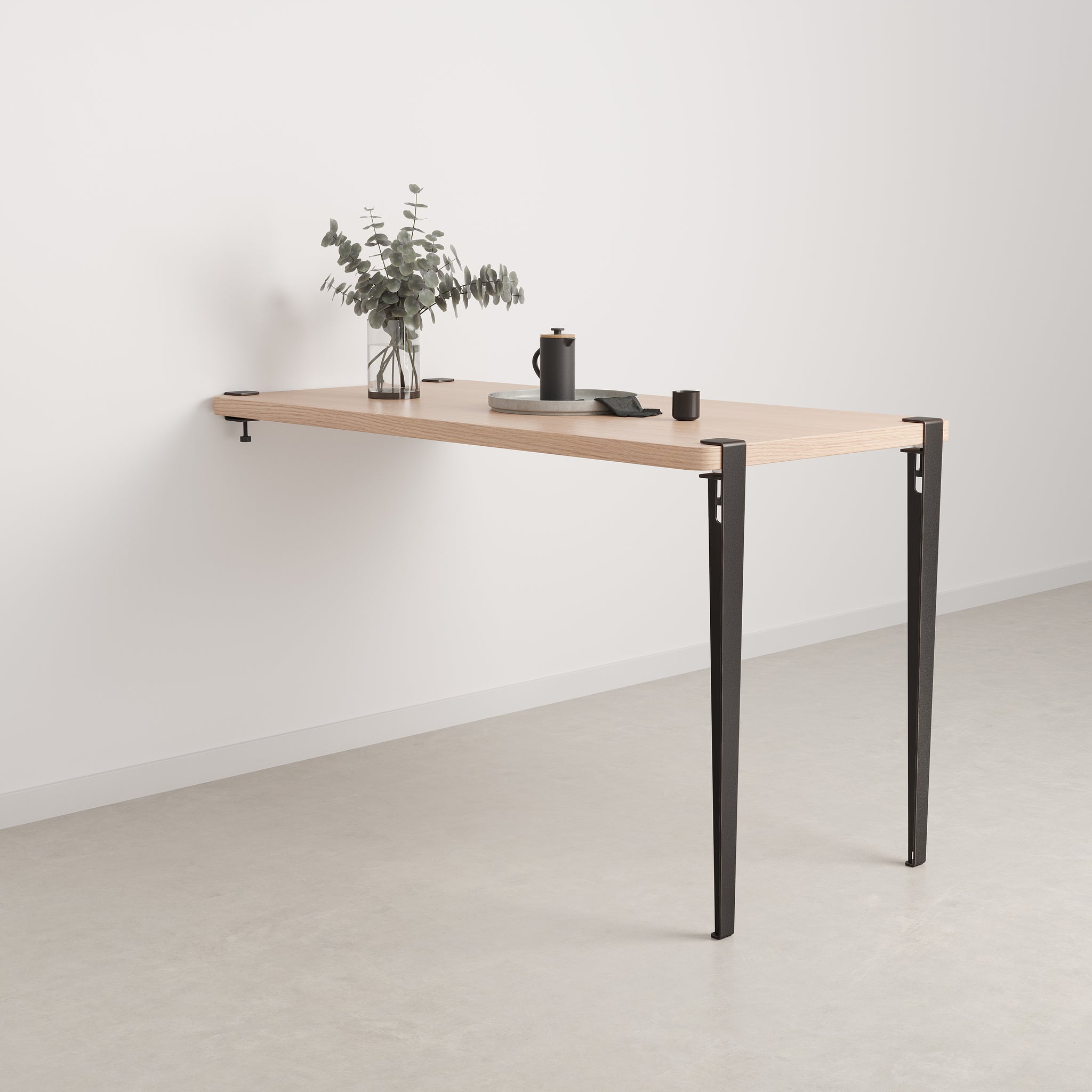 Create a unique and functional space with this wall-mounted dining table, made from beautifully reclaimed old oak. Designed for up to 6 people, it includes two powder-coated steel legs (75 cm) and wall brackets for quick, easy installation. Ideal as a bar, island, or dinner table. Crafted sustainably and 100% made in Europe.