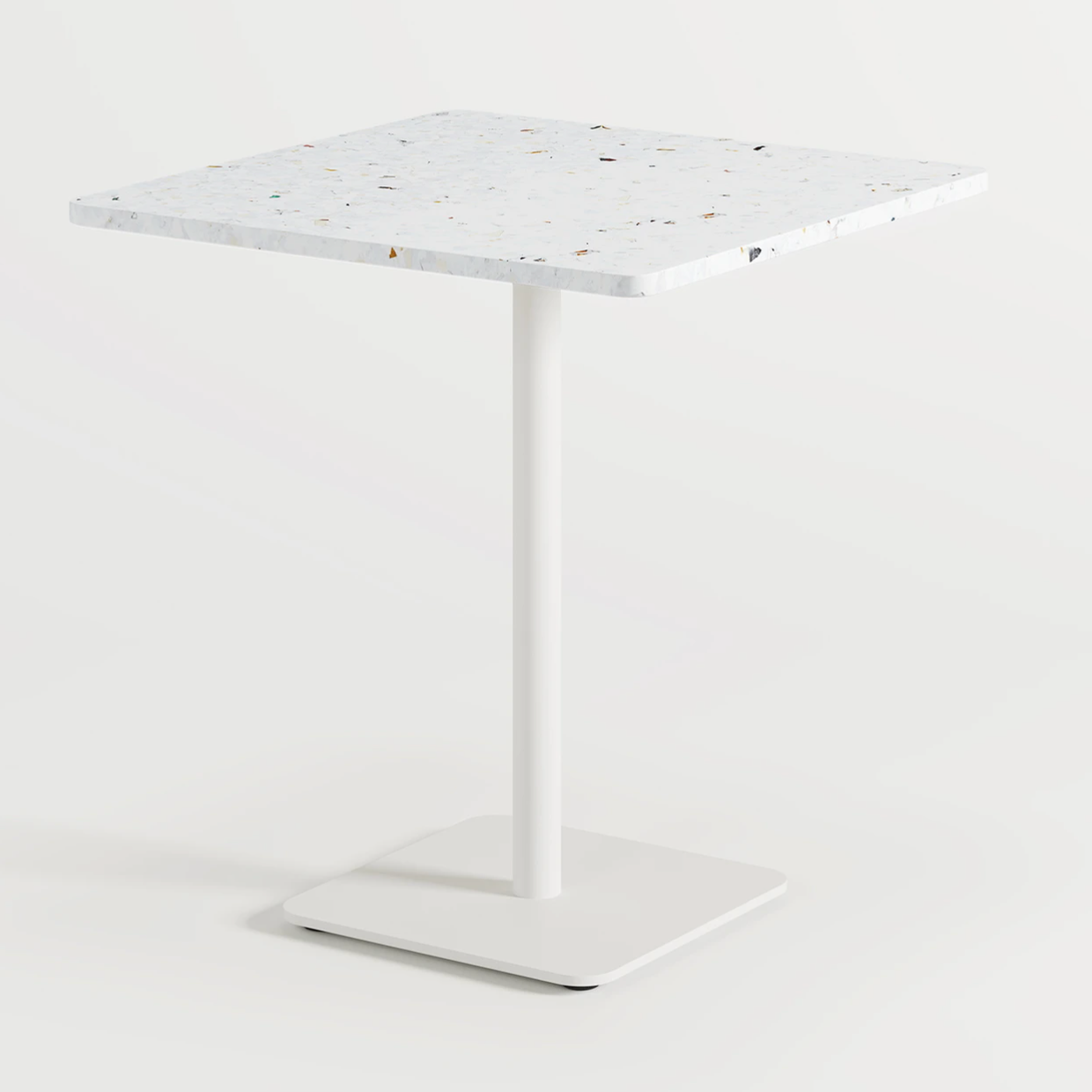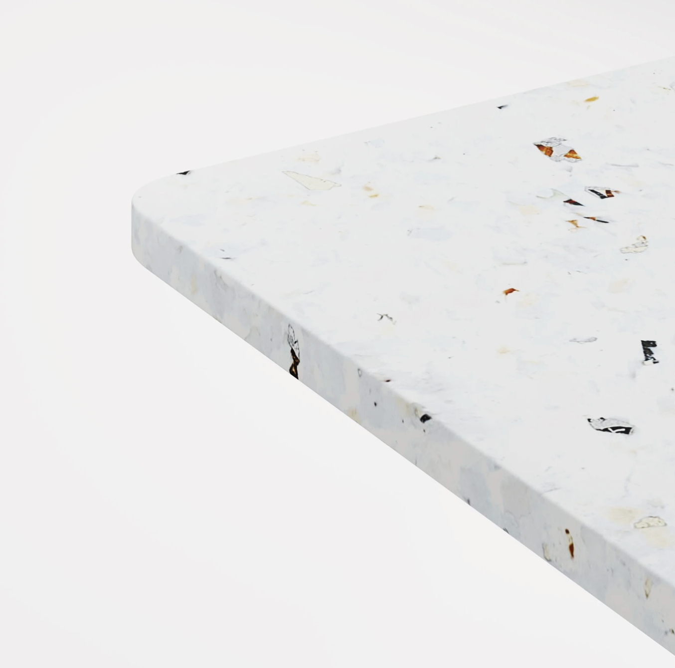 Material: White recycled plastic top made from yoghurt pots. Table legs in powder-coated steel.